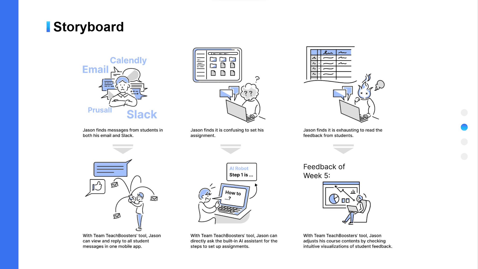 Based on the selected ideas, create storyboards and write scenarios to illustrate user contexts and interactions with the solution.