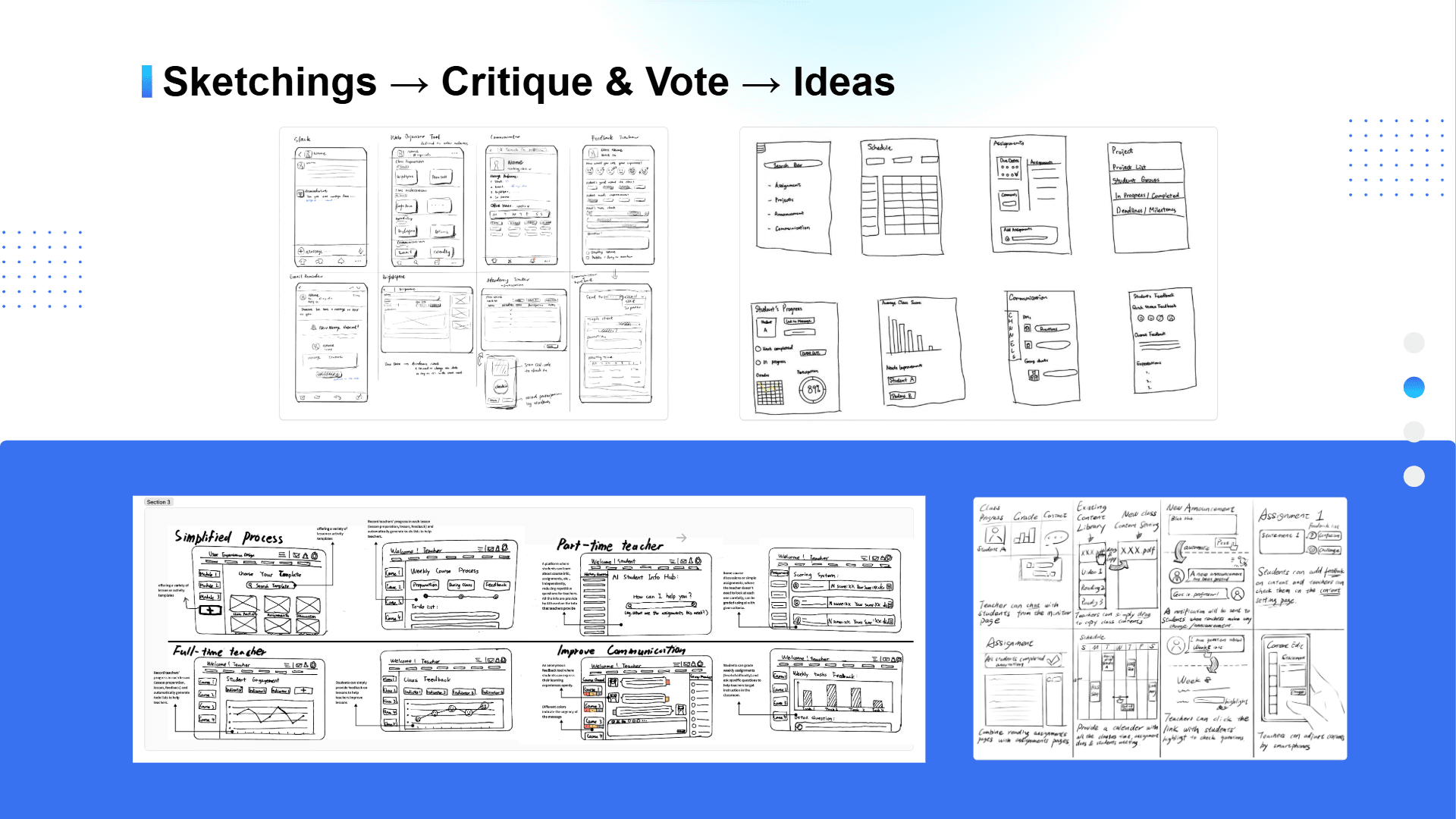 Notably, I played a key role in our team. As for the leadership, as the most experienced in UXD, I often guided the project to ensure clear, logical progress. From a design perspective, I served as the primary UX designer. Four out of the five solutions came from my initial sketches, and I also created three of the final prototypes.