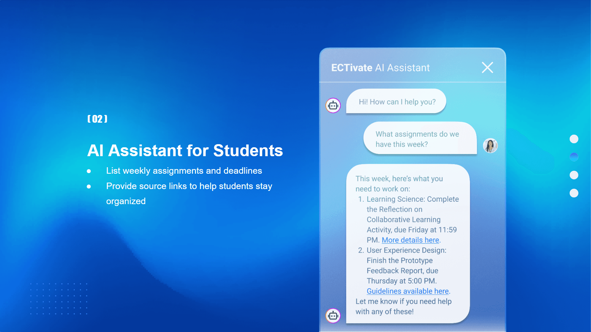 For students, they can ask about their weekly assignments, and the AI will organize a list of tasks and deadlines for all the courses, and also with source links. This feature not only keeps students organized but also reduces the burden on teachers by providing responses about assignments and deadlines.
