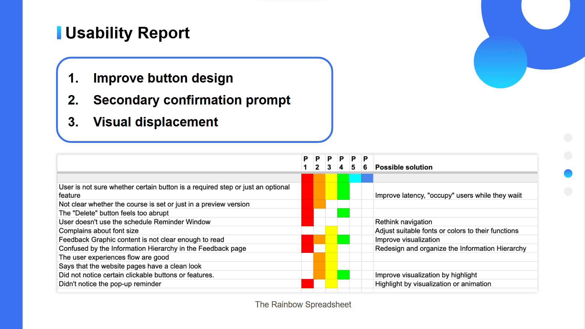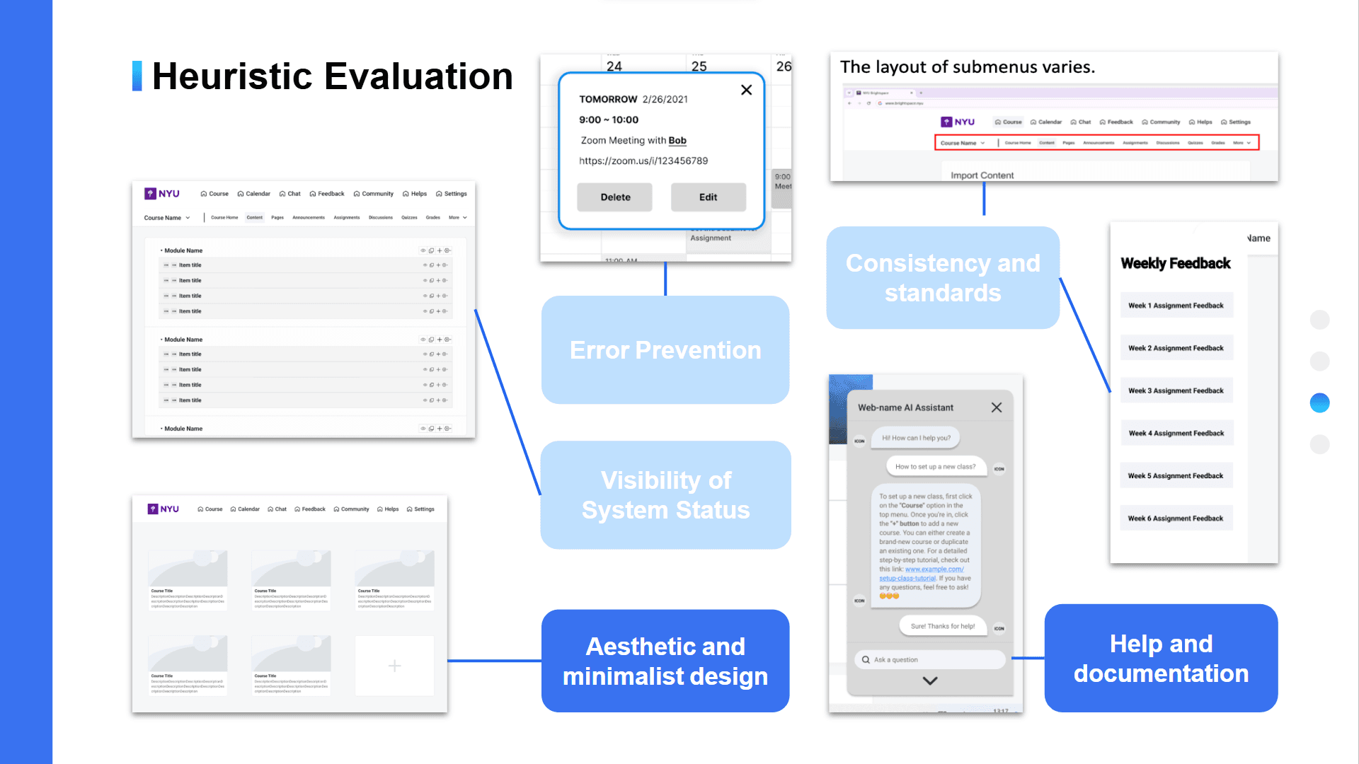 Analyze feedback using Rainbow Spreadsheet and Heuristic Evaluation to determine areas for improvement and iterate on the design.
